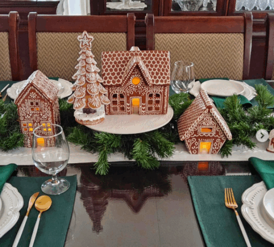 A homemade gingerbread house makes for a stunning, interactive centerpiece, the vibe is festive and whimsical with a sweet, spicy aroma that instantly says “holidays.” For a truly eye-catching display, go all out: assemble sturdy gingerbread walls and roof, pipe on royal icing for snowy rooftops, and use candy canes as columns at the entryway. Line the path with gumdrops and tuck a few fondant snowmen in the yard-kids love helping with these details.