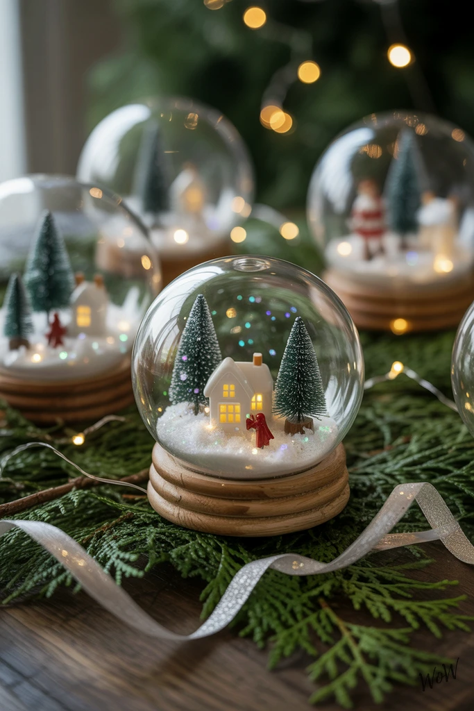 Glittery snow globe centerpieces bring instant winter wonderland vibes to your holiday table, everyone will want to pick one up and peek inside. Grab clear glass domes or upcycle old snow globes, then create tiny scenes with mini trees, little cottages (add battery tea lights for that warm window glow), and small figurines-craft stores have tons of cute options.