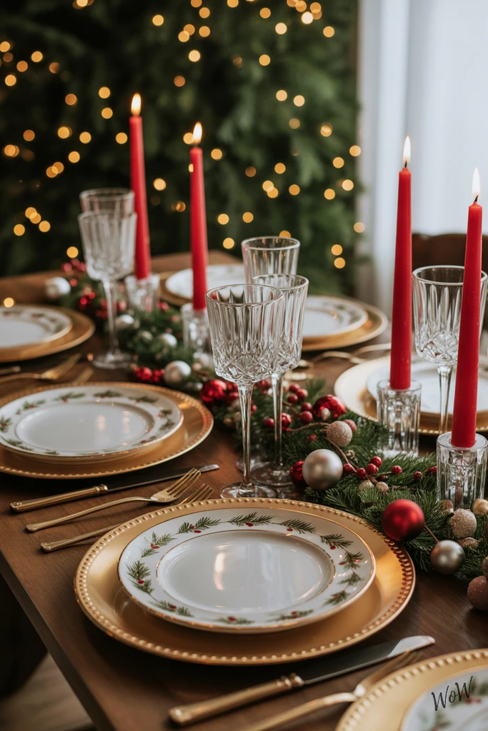 Arrange tiny ornaments and pine sprigs around each plate-this little detail ties the whole table together, making every place setting feel special and intentional. Red tapered candles in crystal holders boost the rich, holiday color palette, especially when the soft, warm lighting reflects off their surfaces.