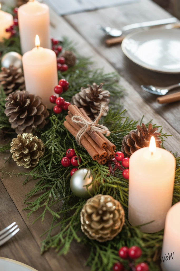 Anchor everything with chunky white pillar candles in different heights, this makes the whole thing look dynamic and warm. The mix of natural textures, soft candle glow, and that spicy-sweet aroma feels inviting and festive, it’s a centerpiece that looks straight out of a woodland holiday story-without any fuss.
