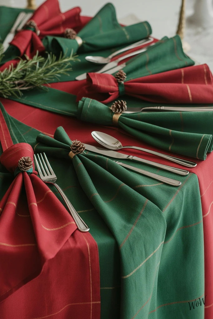 Red and green cloth napkins, folded with care, will set a festive scene-they’re bold, classic, and super inviting. Alternate them around the table for eye-catching color that feels intentional, not chaotic.