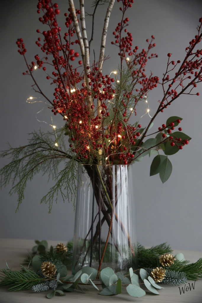 Tuck a string of delicate white fairy lights among the stems-they’ll catch the shine of the berries and light up the deep greens and reds. Place the vase on a bed of fresh pine boughs and eucalyptus, tucking in a few golden pinecones for extra sparkle.