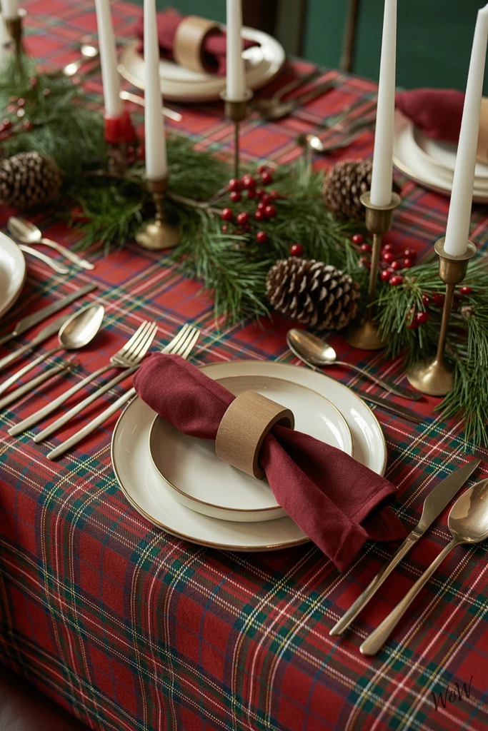 A rich tartan plaid tablecloth easily sets a classic, cozy holiday mood, especially with deep red, forest green, and gold threads woven through. The bold pattern feels festive without being flashy, and it anchors the entire tablescape.