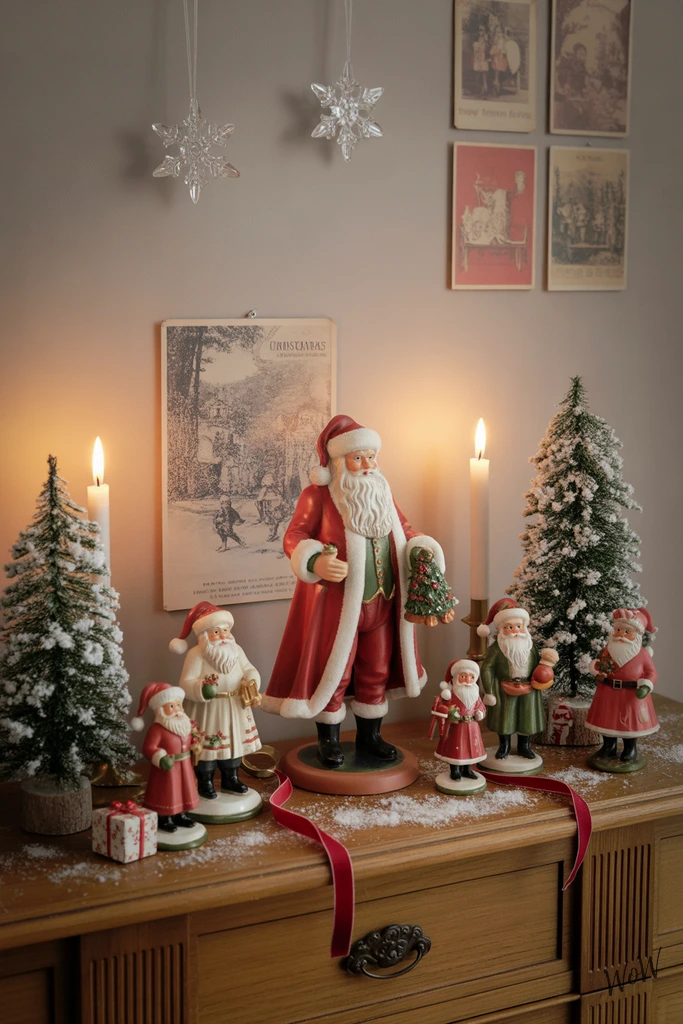 Vintage Santa figurines lined up across a wooden sideboard set a nostalgic mood-they look especially magical grouped together, each with their own quirky charm. Set the scene by nestling tiny, snow-dusted pine trees and a handful of miniature wrapped gifts at their feet, it’s a nod to Santa’s workshop vibes.