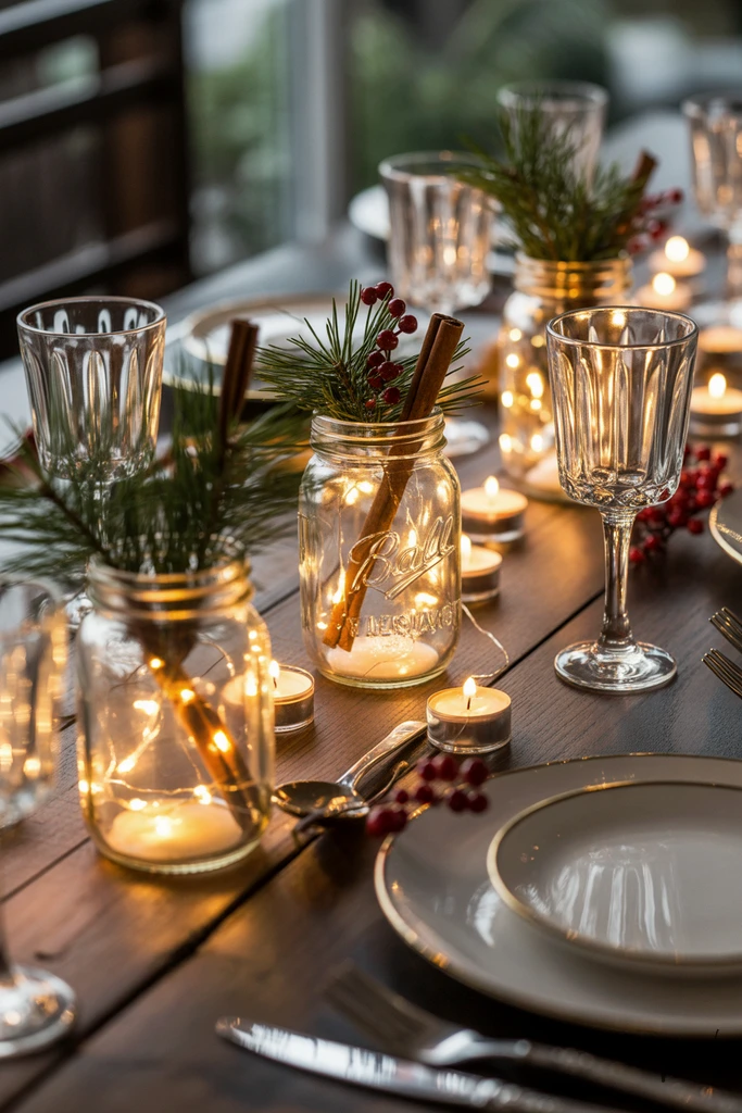 For a rustic holiday touch, wrap pine sprigs and cinnamon sticks around the jars’ rims, securing them with twine; tuck in some faux or real red berries for a pop of color. Scatter the jars down the center of your table, mixing in small tea candles for extra sparkle, just be careful not to crowd the settings.