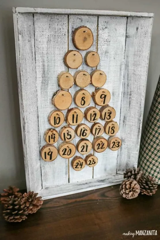 A farmhouse-style advent calendar brings rustic charm and cozy holiday excitement into your home. Made with natural wood slices arranged in a Christmas tree shape, each numbered piece marks the countdown to Christmas in a simple, handcrafted way.