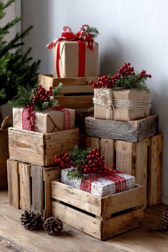 Wooden crate gift boxes add a homespun, rustic vibe to your Christmas decor-plus, they’re totally functional. Start by finding old, weathered crates at thrift stores or flea markets; the more character, the better.
