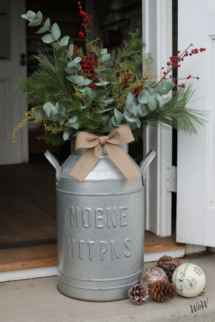 Turn an old galvanized milk can into a showstopping holiday planter, it’s a perfect nod to farmhouse nostalgia. Hunt for a can with a nicely weathered patina and maybe even some original farm stenciling-these details make it feel genuinely vintage.