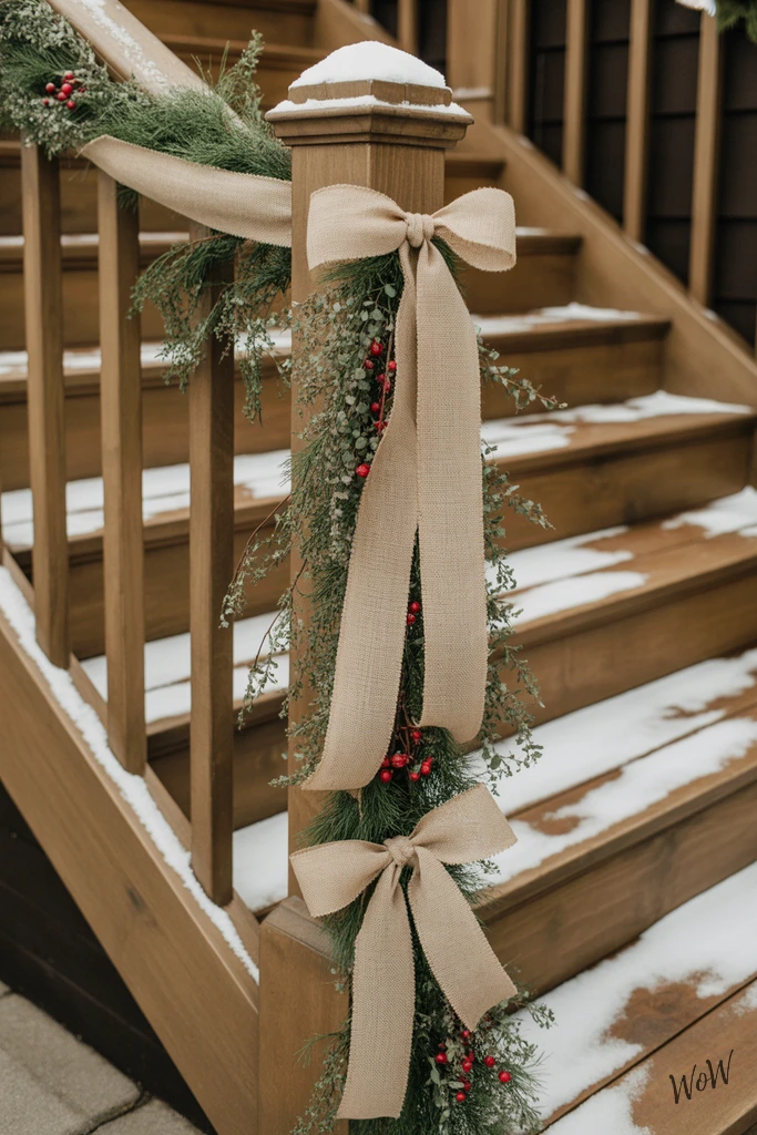 Imagine walking up a staircase where natural burlap ribbon tumbles gracefully down the wooden railing, tied off at each post with an easy bow, it’s got a cozy, handmade vibe that instantly feels festive and relaxed. To recreate this, start with a roll of wide burlap ribbon-let it drape loosely along your railing, securing it at each spindle with a bow that’s not too perfect (that’s part of the charm).