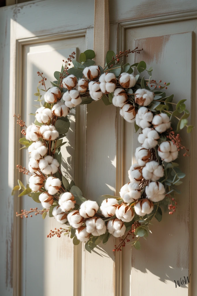 A cotton stem wreath bring that soft, rustic farmhouse vibe to your front door, especially when you add eucalyptus sprigs and a pop of tiny red berries. The fluffy cotton balls with their natural brown pods create a cozy, cloud-like look that stands out against a weathered, wooden door, while eucalyptus adds a hint of green and a fresh, understated scent.