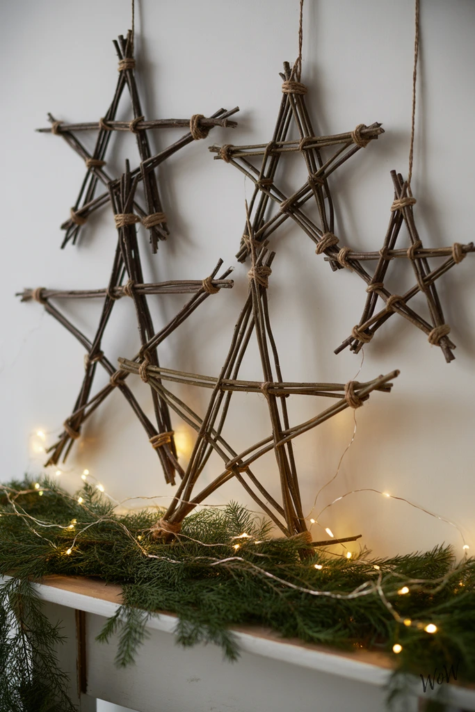 Lay out five twigs in a star shape; use the wire to secure each crossing point tightly, then wrap twine around the joins for that homespun touch. Leave some stars natural for earthy vibes, or brush on a little artificial snow for a frosted effect.