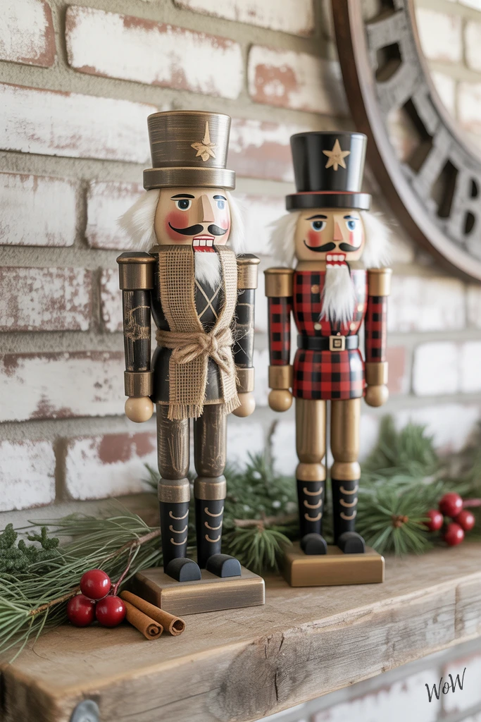 The rustic figures look especially striking against whitewashed brick or vintage metal decor, their reds and blacks popping next to muted tones. Don’t overthink the arrangement, let the nutcracker’s character and your favorite farmhouse touches shine through.