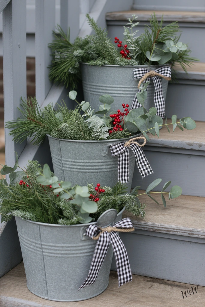 Galvanized metal buckets make a perfect rustic vessel for holiday greenery, the silvery finish gives off a cozy, farmhouse vibe that looks just right on an old set of wooden steps. Grab a few buckets in different sizes-don’t worry if they’re a little beat up, that adds to the charm.