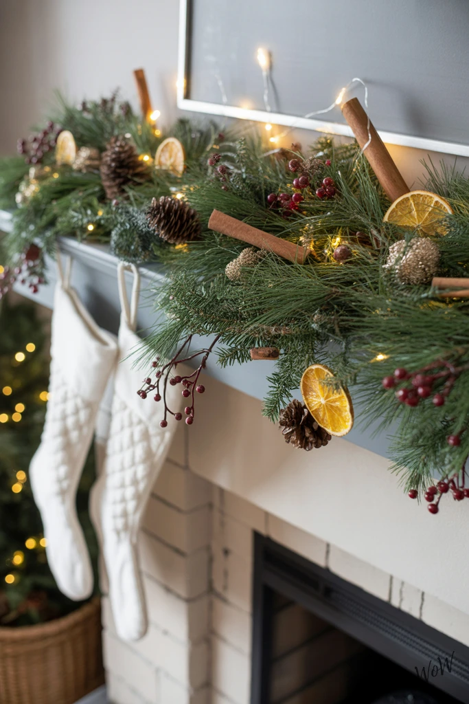 Thread a string of warm fairy lights through the whole garland, making sure they peek out between the greenery and accents. Hang simple white stockings below for a classic farmhouse vibe, and when the lights glow in the evening, the whole scene feels inviting and magical.