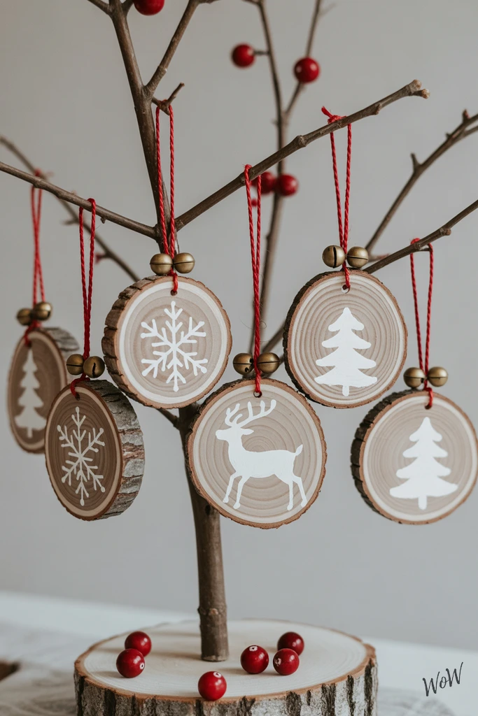 Hand-painted wooden slice ornaments will bring that rustic, homespun vibe to your Christmas decor. Imagine smooth wood rounds, their bark edges left natural for texture, each ornament painted with crisp white folk art designs-delicate snowflakes, prancing reindeer, or tiny Christmas trees, whatever designs you love.