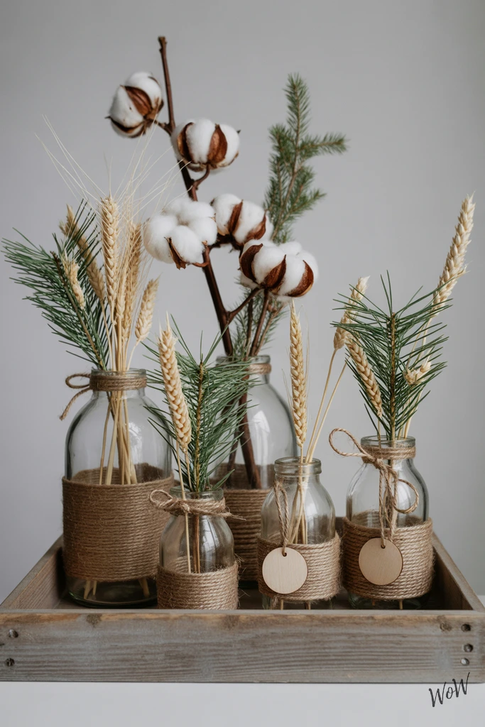 Once wrapped, tie a cute twine bow or add a small wooden ornament for a little extra farmhouse flair. Fill each vase with dried wheat stalks, cotton stems, or pine branches-anything earthy and textured works.