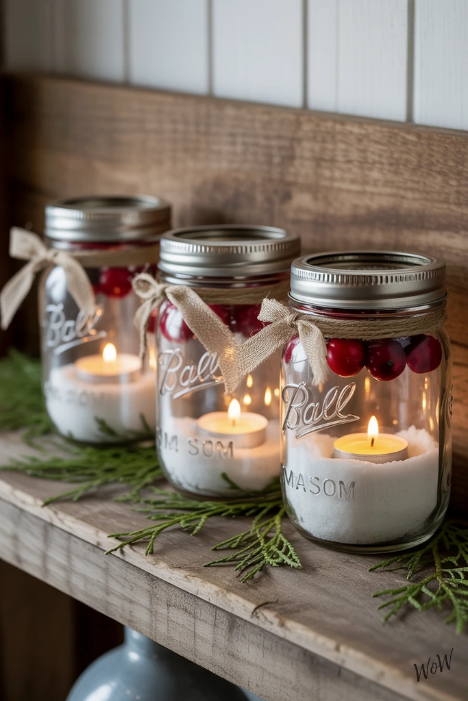 Start with clear mason jars-grab a few in different sizes for some visual interest, then wrap the necks with twine and rustic burlap ribbon, tie a little bow or knot for that homemade touch. Fill the bottom of each jar with a layer of Epsom salt, which looks like fresh snow, and scatter in a handful of red cranberries for a pop of festive color.