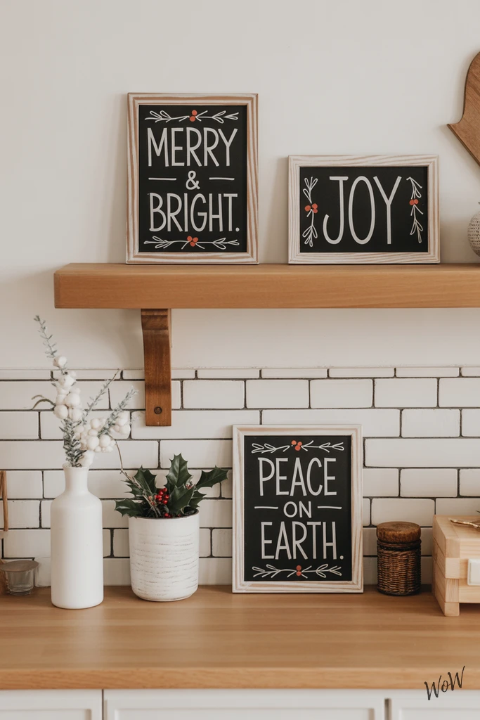 Write simple festive phrases like “Merry & Bright,” “Joy,” or “Peace on Earth” in your best script, don’t worry if it’s not perfect-handwritten looks are part of the charm. Add small chalk doodles, like holly leaves and berries, for a little extra cheer.