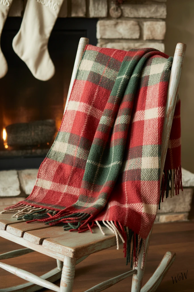 over a weathered wooden rocking chair by the fireplace, and you’ve got instant holiday warmth. Let the fringe edges spill out, a little unraveled only adds to that rustic, lived-in vibe everyone loves around Christmas.