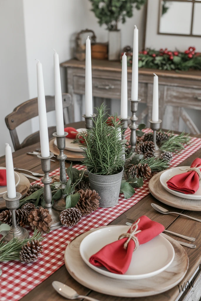 Sprinkle pinecones and fresh greenery along the center, nestling in vintage candlesticks and maybe some small potted rosemary for a festive touch. This setup invites everyone to sit down, relax, and enjoy the holiday together.