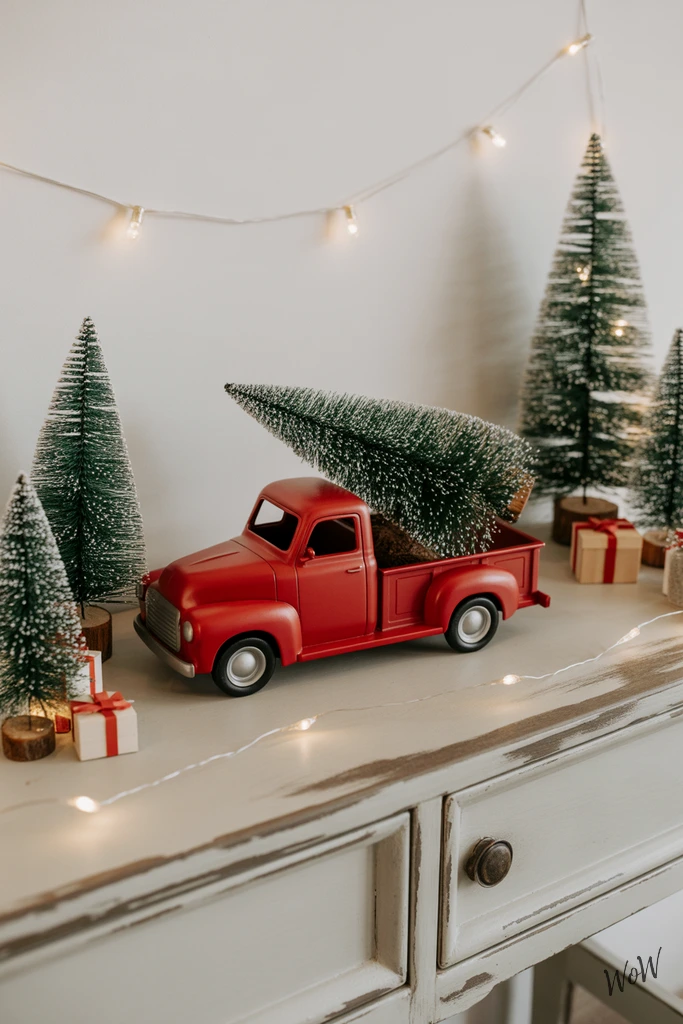 Picture a vintage red metal truck, its paint slightly chipped for that authentic old-time feel, carrying a tiny, fresh-looking Christmas tree in the back-it’s the cutest slice of nostalgia. Set it on a distressed white console table to really amp up the farmhouse vibe.