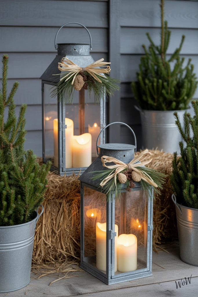 Arrange the lanterns at different heights, flanking them with miniature pine tree’s in galvanized buckets for a layered, woodsy look. The combination of metallics, greenery, and rough hay instantly sets a welcoming, old-fashioned holiday scene, especially as dusk falls and the candles flicker to life.