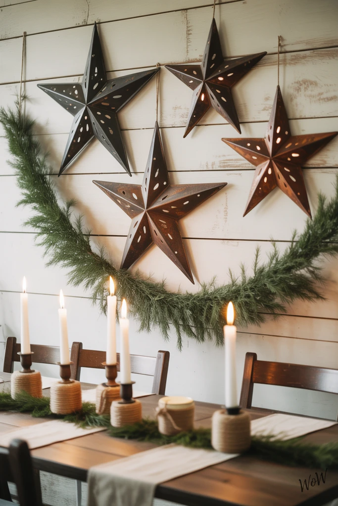 Distressed metal stars make an instant statement, especially when you play with different sizes and cluster them on a whitewashed shiplap wall. The rusted patina gives each star a story, their weathered finish pops beautifully against the crisp white wood.