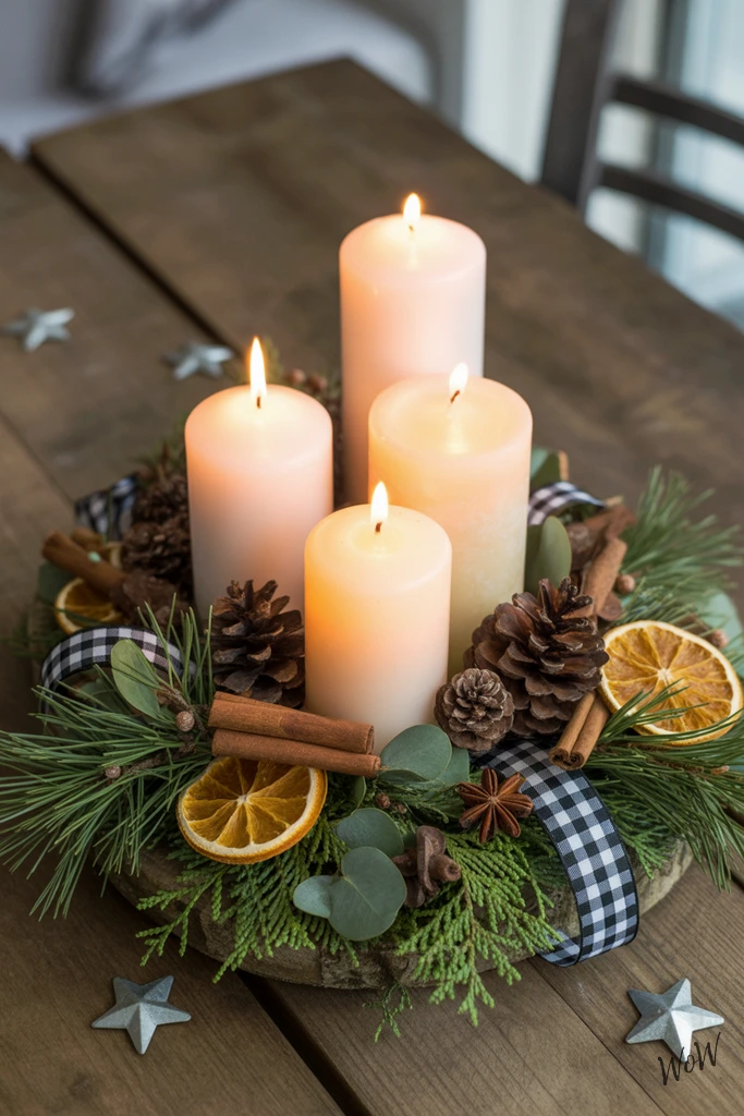 Tuck fresh pine boughs and clusters of pinecones along the base, letting them spill out naturally for an effortless look. Scatter dried orange slices (they catch the light beautifully) and nestle in a handful of cinnamon sticks for a cozy, holiday scent.