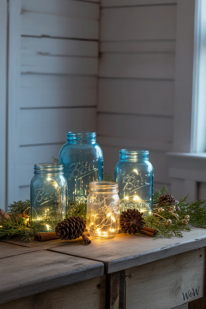 Surround the jars with sprigs of fresh greenery, scatter a few pinecones and cinnamon sticks around for that natural, woodsy vibe (and a cozy scent). As the evening light fades, the soft golden glow from the jars bounces off whitewashed walls, creating a magical, inviting atmosphere.