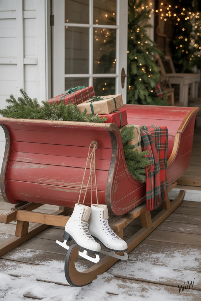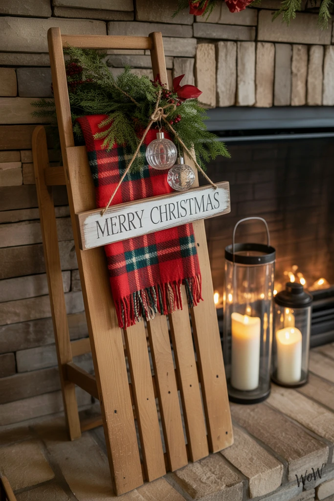 Picture an old wooden sled propped against a rugged stone fireplace-the kind you’d find at a cozy mountain lodge. To make it festive, drape a thick woolen plaid blanket over one side, letting it spill down for that layered, soft look.