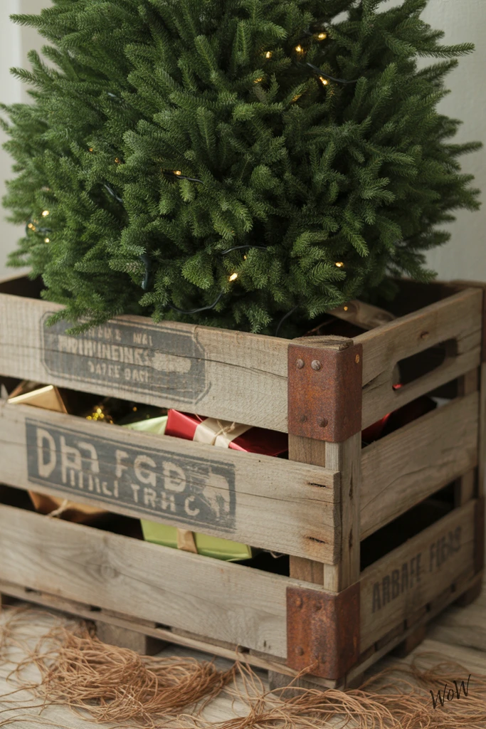 Swap out the usual tree stand for an authentic, weathered wooden apple crate-it’s a total farmhouse game changer. Look for a crate with faded orchard markings and rusty metal corners, the kind that tells a story just by sitting there.