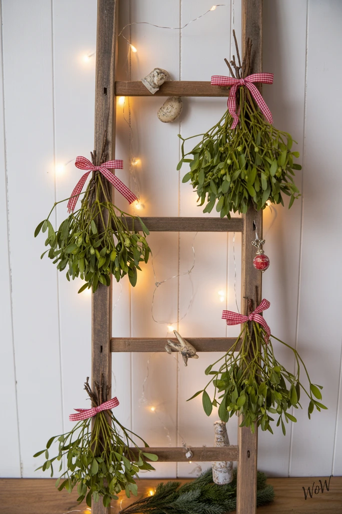 Repurpose an old wooden ladder into a striking Christmas display, leaning it against a crisp white wall for that classic farmhouse vibe. Start by tying fresh, fragrant mistletoe bunches to a few rungs using red gingham ribbon-it’s a playful touch that pops against the wood’s weathered finish.