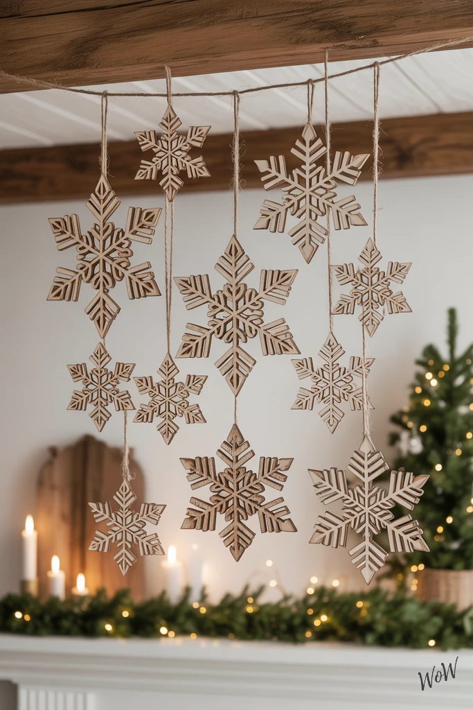 Hand-carved wooden snowflakes are the perfect rustic touch-they bring in that cozy, homespun feel without looking kitschy. Choose a mix of sizes and patterns, some finished in a soft whitewash, others left in natural wood tones; the contrast adds warmth and depth.