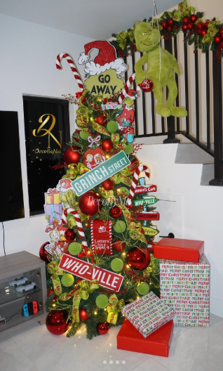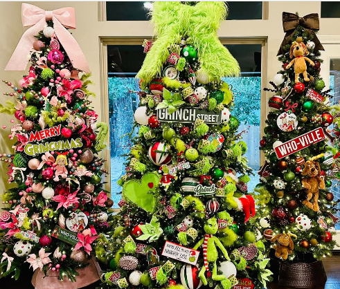 This green Christmas tree is decorated in full Grinch-inspired style, bringing bold color and playful whimsy to the holiday season. Bursting with bright green ornaments, oversized red baubles, candy canes, and themed signs like “Who-ville” and “Grinch Street,” it creates a fun, storybook look.