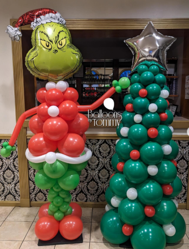 These eye-catching balloon arrangements frame doorways or flank party tables with Grinch flair. Columns are built from alternating green and red balloons, sometimes topped with a Grinch face balloon or Santa hat. The vertical structures add height and impact to your party space, defining areas and creating photo opportunities.