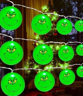 These string lights feature the Grinch’s grumpy face repeated along the cord, lighting up your space with his iconic scowl. Each light cover shows his green face, yellow eyes, and that characteristic frown, glowing warmly when plugged in.