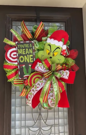 This wreath puts the Grinch front and center on your door. The base is covered in fluffy green fur that mimics the Grinch’s fuzzy appearance, with his signature scowling face in the middle. A tiny red Santa hat sits askew on top, adding to his reluctant holiday spirit.