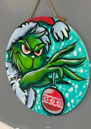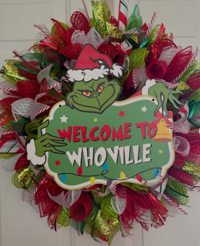 Greet your guests with this cheerful sign that brings Whoville’s quirky charm to your front door. The lettering is usually done in bright, mismatched colors like pink, purple, yellow, and blue, giving it that storybook feel.
