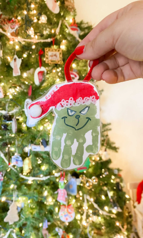 These ornaments feature the Grinch’s distinctive hand shape reaching out toward ornaments or presents. The green fuzzy handprints look like they’re grabbing at the decorations on your tree, creating a playful sense of motion.