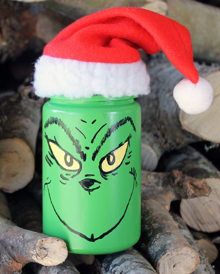 These DIY-style luminaries capture the Grinch in simple, glowing form. Mason jars are painted or covered in green, with the Grinch’s face features added using black and yellow for eyes and a simple curved line for his frown.
