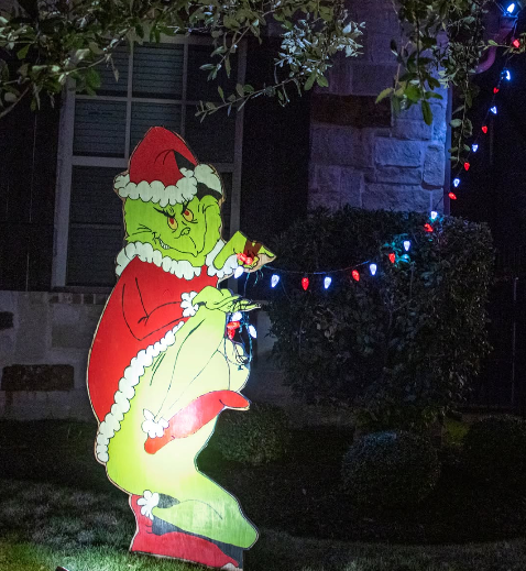 This Grinch Christmas lights yard display brings playful holiday mischief to your outdoor décor. Featuring a large cutout of the Grinch dressed in his classic Santa outfit, it looks as if he’s sneaking away with your string of colorful Christmas lights.