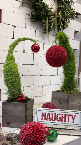 Add some furry green picks between branches for texture, and top it with a red bow or Santa hat. The whole effect captures the Grinch’s signature color scheme while still feeling festive and fun for the holidays.