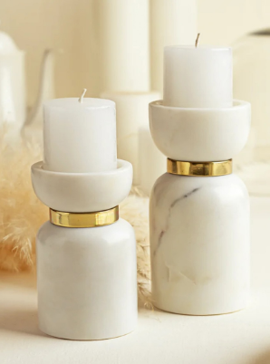 5. Marble and Brass Candle Holders with Ivory Pillar Candles
