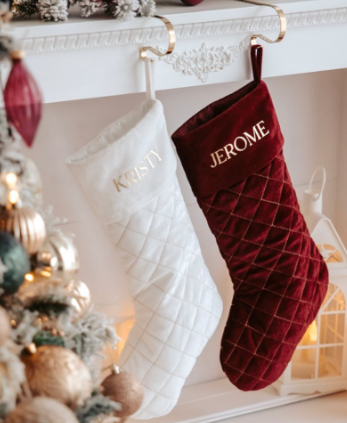 Monogrammed embroidery adds a personalized touch that makes each stocking feel special and intentional. Choose thread colors that either match or contrast with the velvet for different effects, gold thread on navy velvet feels classic, while white on burgundy creates striking contrast. The weight of velvet allows the stockings to hang beautifully with elegant draping. These become keepsakes that you’ll bring out year after year.