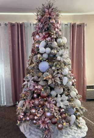 This Christmas tree glows with elegance, blending soft blush tones with frosty accents for a look that feels dreamy and refined. Layers of pale pink, champagne, and white ornaments fill every branch, catching the light in a gentle shimmer.