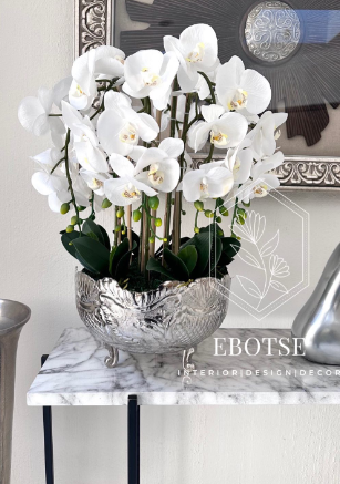 This elegant Christmas decor idea brings refined sophistication to the season with a stunning arrangement of white orchids displayed in a gleaming silver vessel. The polished metallic base adds a festive shimmer, while the delicate blooms introduce softness and balance.