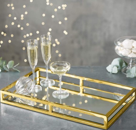 Mirrored trays double the visual impact of whatever sits on them through reflection. Vintage champagne coupes have elegant stems and bowl shapes that work beautifully as ornament displays. Nestle small ornaments inside the glasses and scatter a few around the base on the tray.