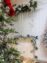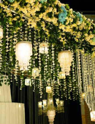 This dazzling Christmas decor idea combines elegance and enchantment with cascading florals and shimmering light. Crystal chandeliers hang gracefully among streams of white blooms and trailing greenery, creating a canopy that feels luxurious yet soft.