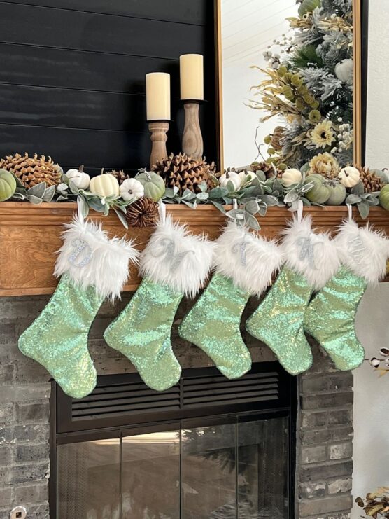 Hang hand-knitted cream stockings trimmed in pastel mint; the soft wool texture feels cozy and luxe. Personalize each stocking with a wooden name tag tied on with twine, and tuck in a sprig of baby’s breath for a subtle, fresh detail; you can snip baby’s breath from a bouquet or pick up a small bundle at the florist.