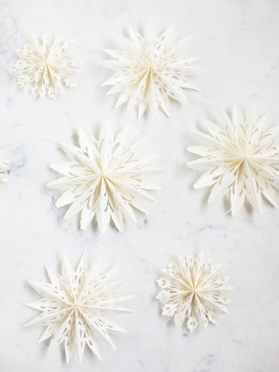 Delicate, creamy white snowflakes cut from shimmery paper look stunning when they’re hung at different heights on nearly invisible threads, it’s like they’re floating midair. The effect is soft and dreamy, especially against pale mint walls-the subtle shadows they cast add extra depth and movement.